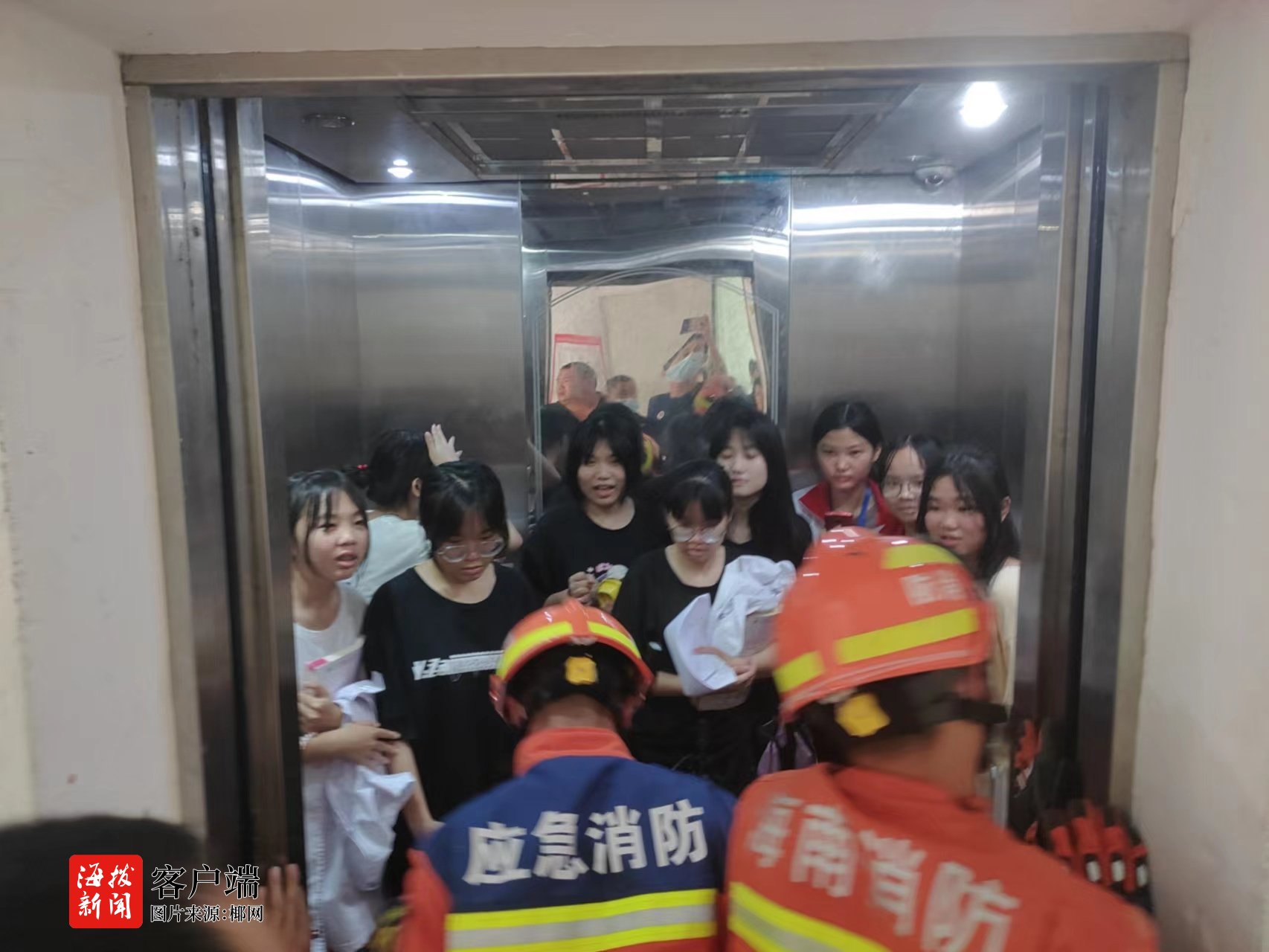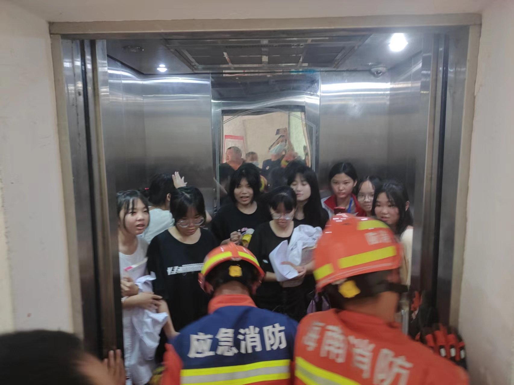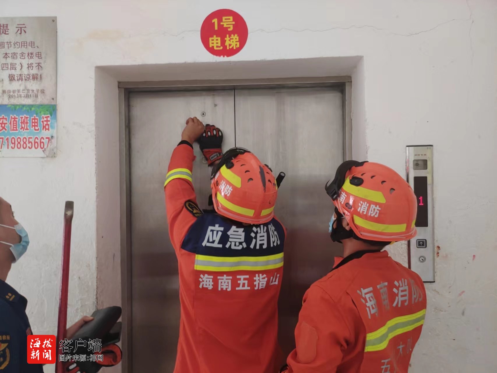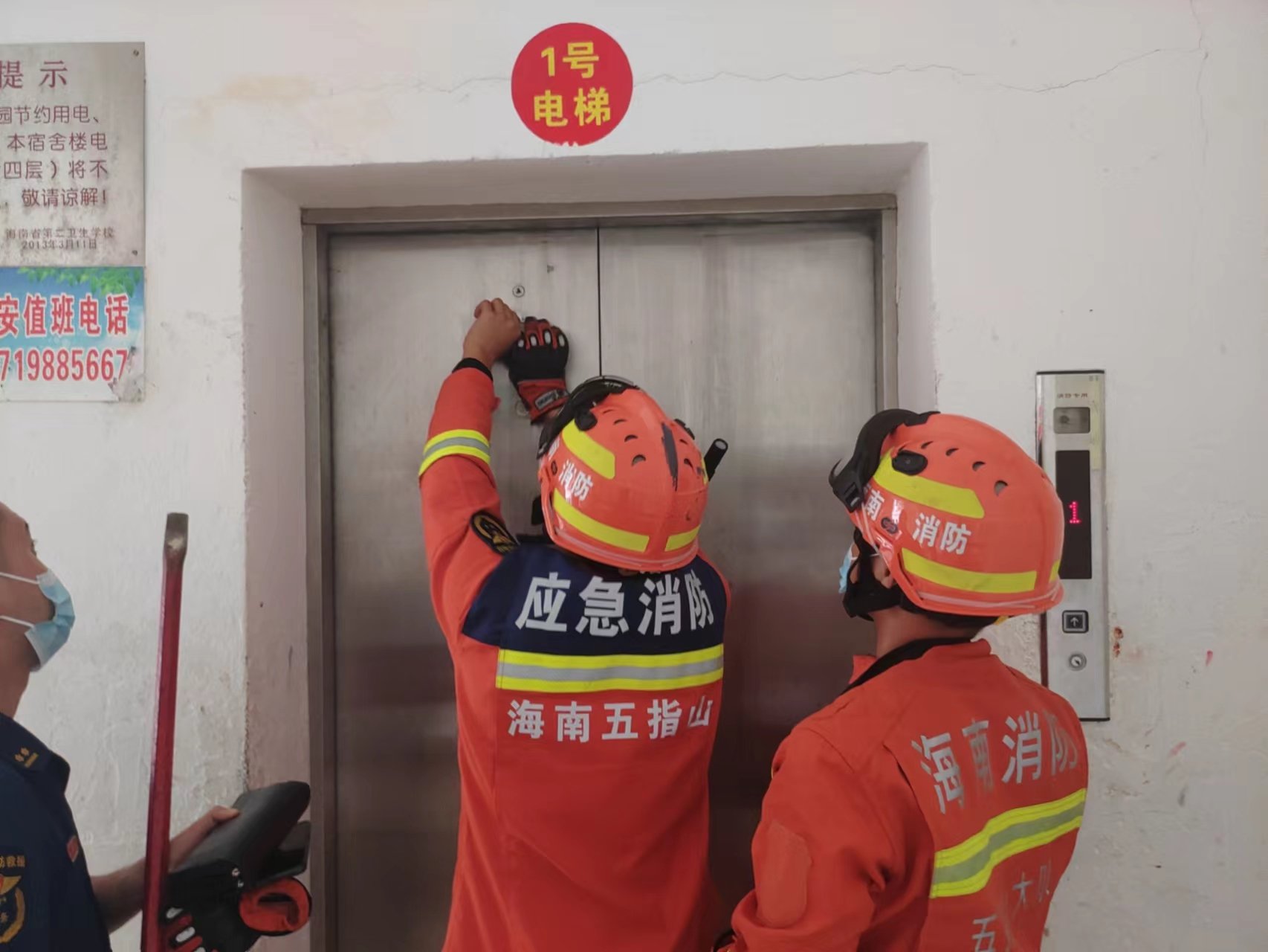 商报全媒体讯(椰网/海拔手机端记者 谢佳宁 通讯员 岑冬梅 摄影报道)6月10日12时16分,五指山市消防救援大队指挥中心接到报警称,位于海南省第二卫生学校宿舍楼内一部电梯发生故障,导致9名学生被困电梯内,情况紧急,请求消防救援人员前往处理。五指山市通什消防救援站紧急出动7名消防员赶赴现场处置。