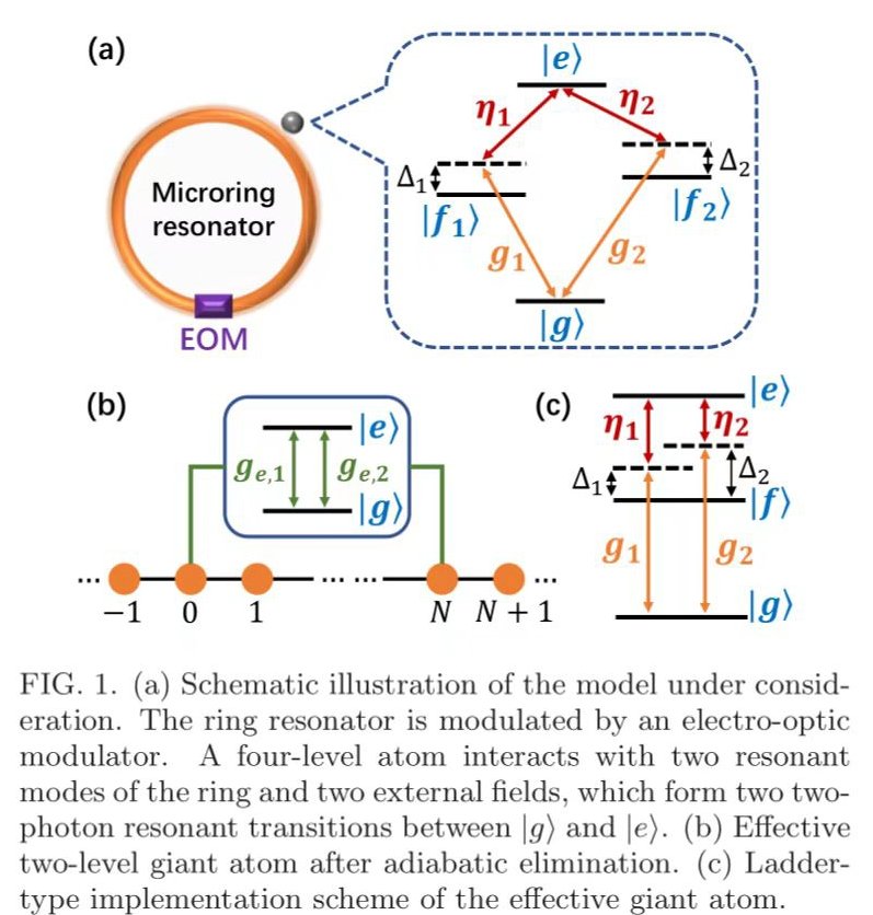 据介绍,“巨型原子”通常是指在空间上与波导存在非局域多点耦合的量子发射器,这一结构特征使得巨型原子系统通常有着较大的空间尺寸,不利于进一步的集成,并且在某些情况下,如在考虑波导为耦合腔阵列时,会消耗较多的物理资源。为解决这类问题,该论文考虑在一维合成频率维度中构造有效的巨型原子结构。这种合成维度中的模型不仅为研究巨型原子效应提供了更加小型化和资源节约的平台,并且为构造更高维度的巨型原子结构提供了可行的方案。