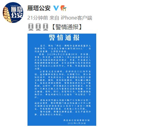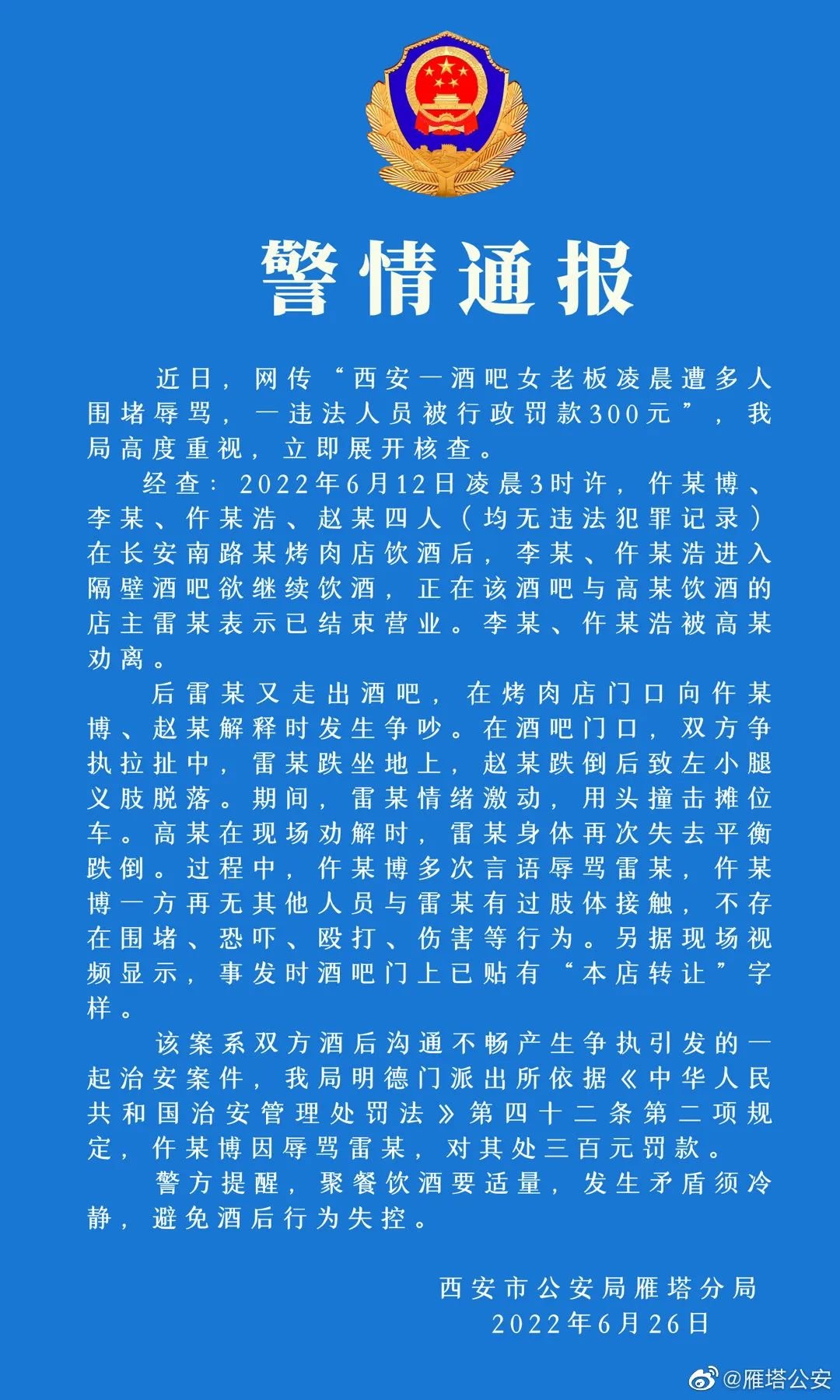26日,@雁塔公安就“西安一酒吧女老板凌晨遭多人围堵辱骂,一违法人员被行政罚款300元”一事发布警情通报,全文如下: