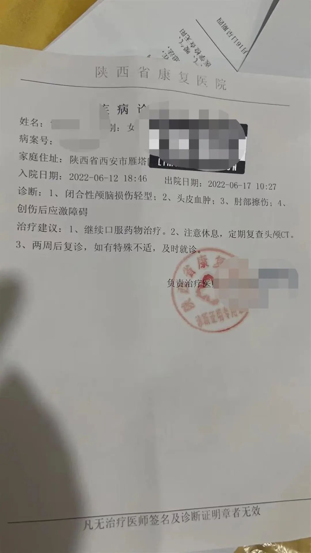 “当天我感觉不舒服,到医院去做了检查。”24日,萱萱给极目新闻记者发来了一份《疾病诊断证明书》。诊断书上,诊断内容为闭合性颅脑损伤轻型、头皮血肿、肘部擦伤。住院时间从6月12日到6月17日。医生建议其继续口服药物治疗,注意休息,定期复查头颅CT,并及时复诊。