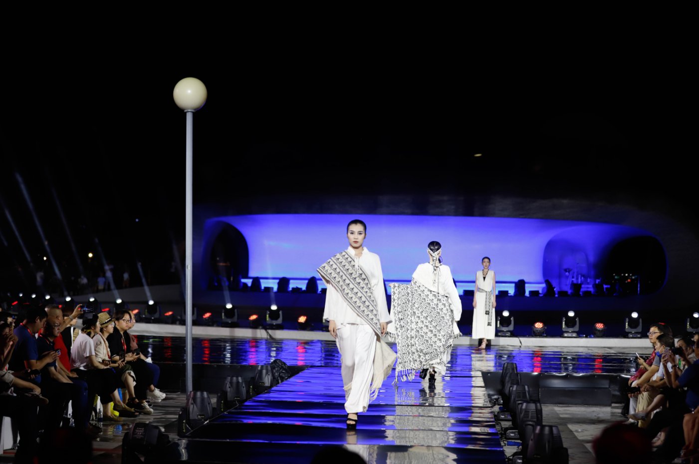 时装大秀现场成为了跨越时空的梦幻通道,开篇序曲以海南黎族两项非物质文化遗产技艺,黎族钻木取火技艺和黎族树皮布制作技艺,进行情景演艺,象征黎族文化的伊始,体现黎族人民的智慧对人类社会的伟大贡献。之后引入“岛夷卉服、厥篚织贝”(出自尚书《禹贡》中,译文东南沿海岛民穿着利用草棉织布的衣服)的场景,融入海南黎族传统纺染织绣技艺表演,体现黎族人民对我国古代纺织业的贡献。