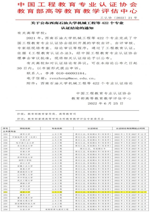 商报全媒体讯(椰网/海拔新闻记者 鲁启兰 通讯员 刘清怡)近日,中国工程教育专业认证协会、教育部高等教育教学评估中心发布通知,公布了2022年工程教育专业认证结论。海南大学土木工程专业通过工程教育认证,有效期为2022年1月至2027年12月。