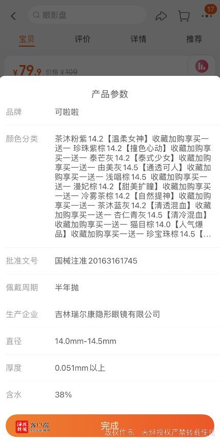 记者点开月销量最高的美瞳商品链接发现该款美瞳月销量为9万+,佩戴周期为半年抛,售价为79.9元两幅(链接显示买一赠一),批准文号也有说明。记者又搜索“海昌半年抛美瞳”发现,海昌半年抛美瞳多为单片销售,若想购买一副则需拍下相同的两份,其官方旗舰店销售最为火热的半年抛美瞳售价为60元一片,加上店铺优惠后,一副则为77.53元。而记者打开2014年的一份《美瞳批发价格表》并找到了海昌半年抛价格,价格均为30元至66元一副,其中40多元一副的价位居多。