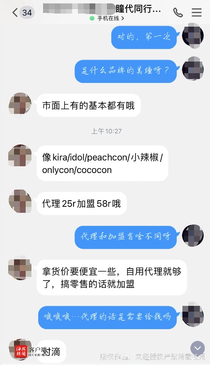 随后,记者以应聘“瞳代”的方式联系上了正在招募美瞳代理的小林。小林告诉记者,成为“瞳代”需要缴费,普通代理25元,加盟代理58元,区别则是拿到的美瞳批发价格高低不同。“加盟代理拿货价便宜一些,如果是自己用的话办理一个普通代理还挺划算的。”小林表示,成为“瞳代”并不需要什么其他要求,自己可以在给到的批发价格往上加自己的利润。