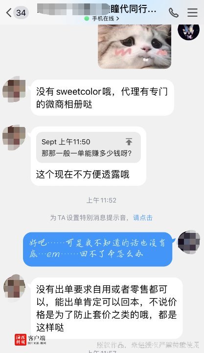 方女士告诉记者,招募人员并不要求自己每个月需要卖出多少单,只要拿货不低于价格表中的价格即可。“卖出去一副价格表为20元的美瞳,客户让我下单的时候我付20元就可以,我给客户说的价格自己可以随便加,卖120元都没人管我,最后净赚的100元,而且需客户先给钱我才和上家下单发货,根本不用自己出任何本钱。”方女士表示,因为美瞳牌子的五花八门,大多数客户并不清楚其中成本及批发价格,且属于软镜类型,许多客户便认为价格理应便贵。时间长了以后,方女士不满足于一个人售卖美瞳,便开始招募属于自己的代理,并将原本价格表的价格翻倍卖给自己招募的代理,这样一来有时不用费时费力,便能赚到一笔。