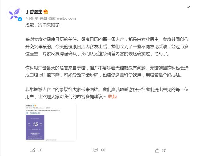 2021年10月15日,丁香医生就健康日历内容“喝无糖的碳酸饮料不会损伤牙齿”引发争议致歉。丁香医生表示,经过与多位医生、专家反复沟通确认,认为这条科普内容的表述确实过于绝对。