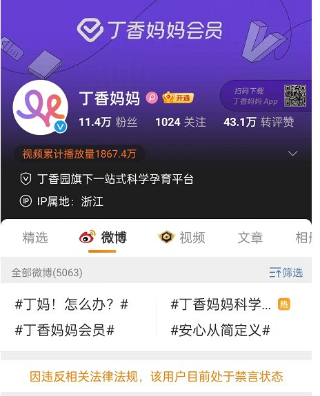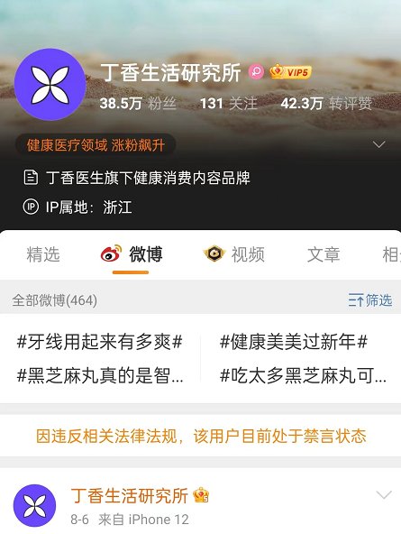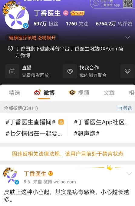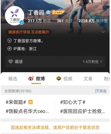 在微博平台,@丁香医生 @丁香园 @丁香妈妈 @丁香生活研究所 @丁香用药助手等账号均显示“因违反相关法律法规,该用户目前处于禁言状态”。其中@丁香医生和@丁香园都是粉丝数超百万的网络大V。