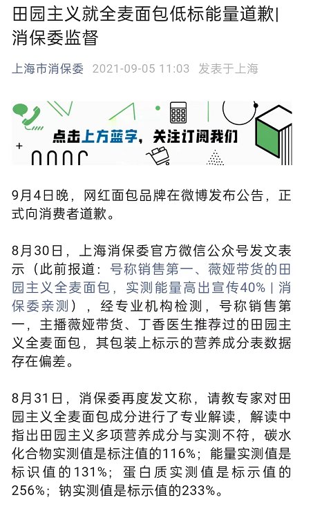 2021年8月30日,田园主义全麦面包遭上海市消保委点名,称其虚标营养成分,实际热量远超标示值。涉事欧包介绍页面上曾注明了“丁香医生推荐”字样。据了解,双方曾经推出联名礼盒。