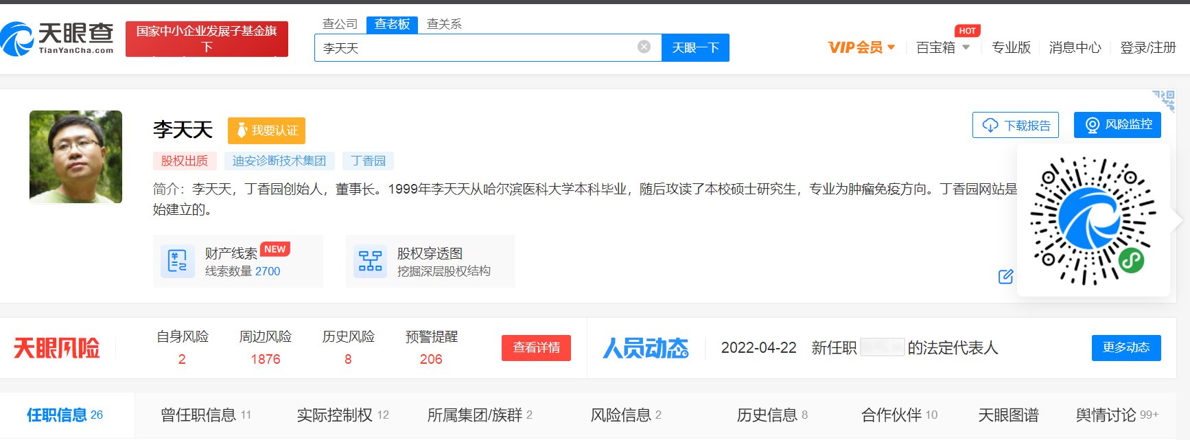 据天眼查信息显示,丁香医生、丁香妈妈、丁香园等均是杭州联科美讯生物医药技术有限公司旗下自媒体品牌,丁香园创始人、董事长是李天天,1999年李天天从哈尔滨医科大学本科毕业,随后攻读了本校硕士研究生,专业为肿瘤免疫方向。丁香园网站是2000年在他读研期间开始建立的。目前,丁香园网站还能正常浏览。