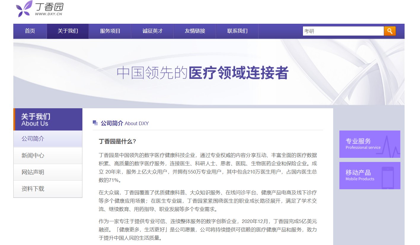 公开资料显示,丁香园是一个医学知识分享平台。官网简介显示,丁香园是中国领先的数字医疗健康科技企业,通过专业权威的内容分享互动、丰富全面的医疗数据积累、高质量的数字医疗服务,连接医生、科研人士、患者、医院、生物医药企业和保险企业。成立20年来,服务上亿大众用户,并拥有550万专业用户,其中包含210万医生用户,占国内医生总数的71%。