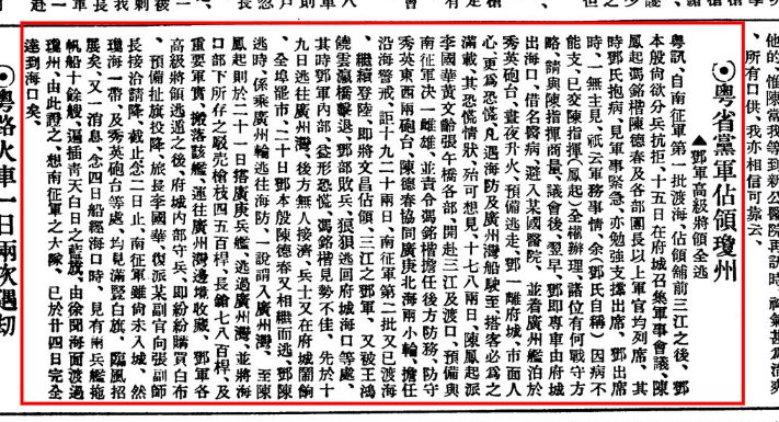 那是1926年1月15日,在国民革命军南征军第一批渡海占领铺前、三江之后,邓本殷尚欲分兵抗拒。是日,他在琼州府城召集军事会议,陈凤起、冯铭楷、陈德春及各部团长以上军官均列席,“其时邓氏抱病,见军事紧急,亦勉强支撑出席。邓出席时,一无主见,只云军务事情,余(邓氏自称)因病不能支,已交陈指挥(凤起)全权办理,诸位有何战守方略,请与陈指挥商量。议会后,翌早,邓即专车由府城出海口,借名医病,避入某国医院,并着广州舰泊于秀英炮台,昼夜升火,预备逃走”。(《粤省党军占领琼州邓军高级将领全逃》,《时报》1926年2月1日,第4版)