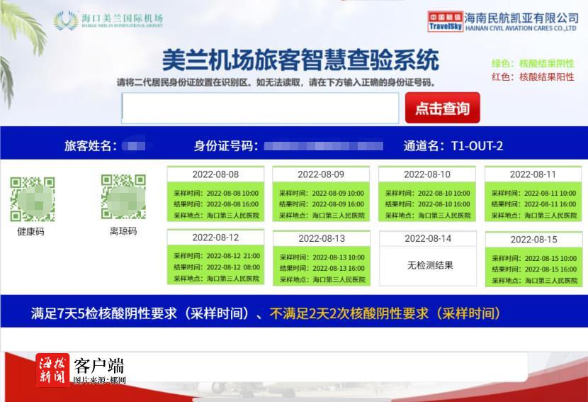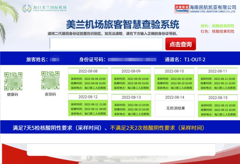 据介绍,为匹配实时的旅客出岛防疫政策,美兰机场第一时间组织团队对出港旅客智慧查验系统进行持续的优化升级,做到直观展示旅客的健康码、离琼码、包含当日在内的8天核酸采样时间、采样地点、核酸结果及时间,并对旅客是否满足通行条件进行判断提醒。与此同时,安排人员每天24小时现场运维保障,及时收集现场工作人员的反馈意见,确保信息防疫系统的稳定高效运行。