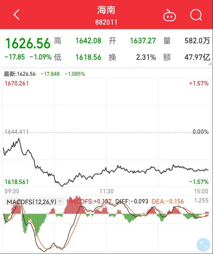 18日,海南板块低开低走,截至收盘跌1.09%报收1626.56点,总市值2312.5亿元,较上一交易日缩水21.7亿元。个股6涨22跌。涨幅方面,金盘科技涨7.58%领涨,ST海航涨2.67%,ST基础涨1.18%,其余个股涨幅均低于1%。跌幅方面,中钨高新跌3.95%居前,海南椰岛跌3.11%、京粮控股跌2.98%分列二三位。