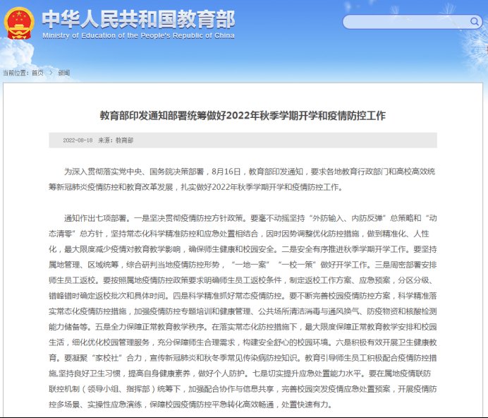 教育部日前印发通知,要求各地教育行政部门和高校高效统筹新冠肺炎疫情防控和教育改革发展,扎实做好2022年秋季学期开学和疫情防控工作,按照属地疫情防控政策要求明确师生员工返校条件,制定返校工作方案、应急预案,分区分级、错峰错时确定返校批次和具体时间。详情