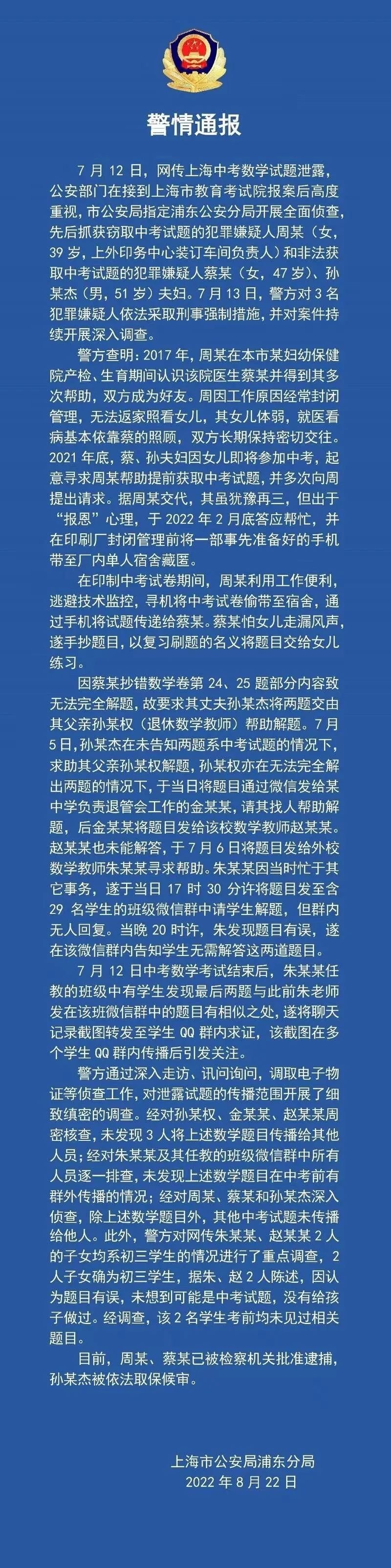 3.22日,上海市公安局浦东分局发布警情通报称,已对窃取中考试题的犯罪嫌疑人周某和非法获取中考试题的犯罪嫌疑人蔡某、孙某杰夫妇依法采取刑事强制措施。具体通报→详细>>>