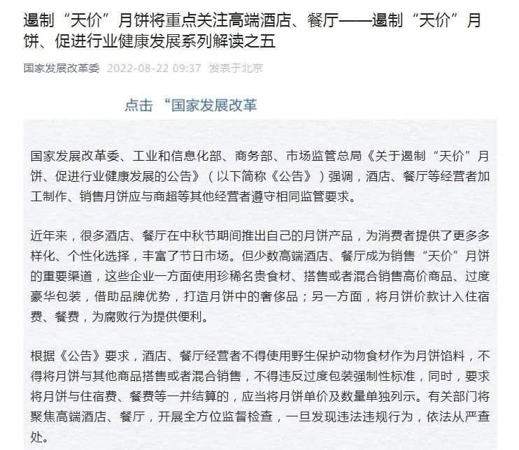 2.22日,国家发展改革委、工业和信息化部、商务部、市场监管总局《关于遏制“天价”月饼、促进行业健康发展的公告》强调,酒店、餐厅等经营者加工制作、销售月饼应与商超等其他经营者遵守相同监管要求。详细>>>