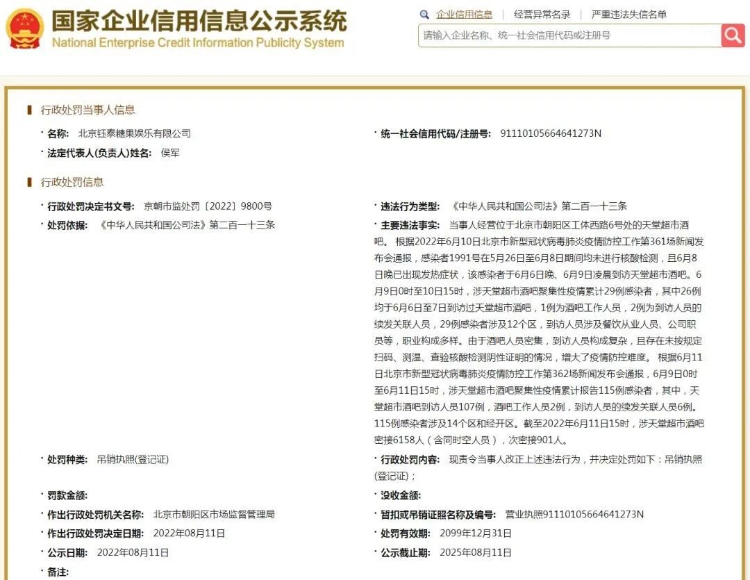 4.北京市朝阳区市场监管局近日做出行政处罚决定,北京天堂超市酒吧经营者——北京钰泰糖果娱乐有限公司被吊销执照(登记证)。详细>>>