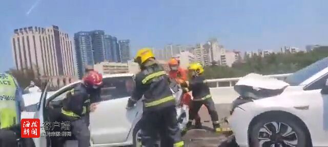 商报全媒体讯(椰网/海拔新闻记者 陈勇合 摄影报道)“世纪大桥上发生追尾事故,有人被夹在车中间,已经不行了。”9月15日13时25分许,有网友向国际旅游岛商报记者报料称,海口世纪大桥上发生一起交通事故,三辆小车追尾,有人被卡在两车中间,似乎已无生命体征,海口公安交警、消防救援人员、120急救人员均已赶到现场。