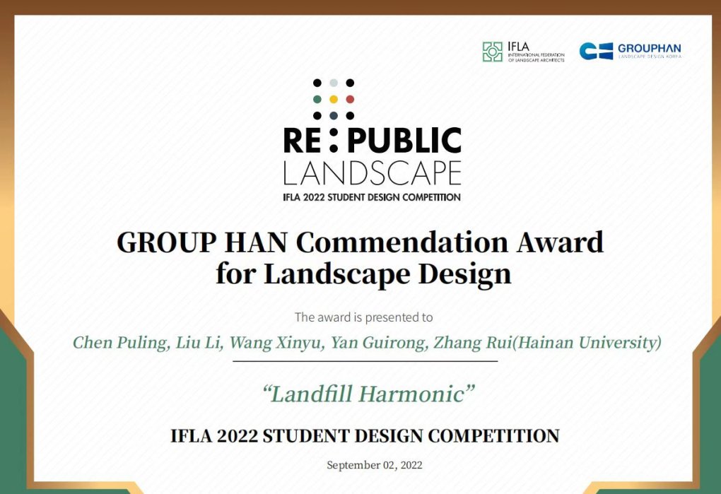 商报全媒体讯(椰网/海拔新闻记者 鲁启兰)近日,第58届国际风景园林师联合会(IFLA)世界大会在韩国光州举办。海南大学林学院2021级风景园林学研究生陈璞玲、刘丽、王新禹、闫桂荣、张瑞设计的作品“Landfill Harmonic”(填埋场的和旋)获得国际学生竞赛景观设计类别二等奖。
