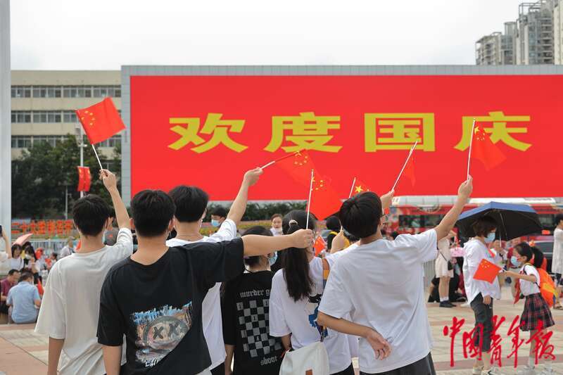 10月1日,广西南宁市民族广场,几名年轻人手舞国旗在写有“欢度国庆”字样的电子屏前留影。中青报·中青网记者 谢洋/摄