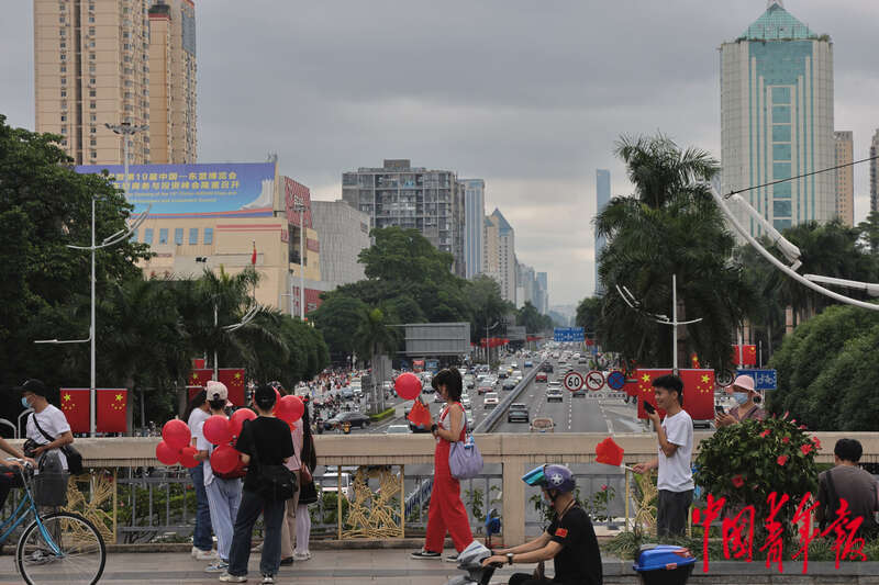 10月1日,市民从新民立交桥走过,他们身后的民族大道上挂满国旗,国庆氛围浓厚。中青报·中青网记者 谢洋/摄