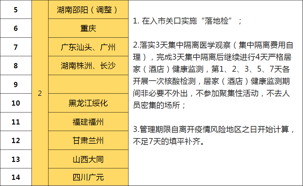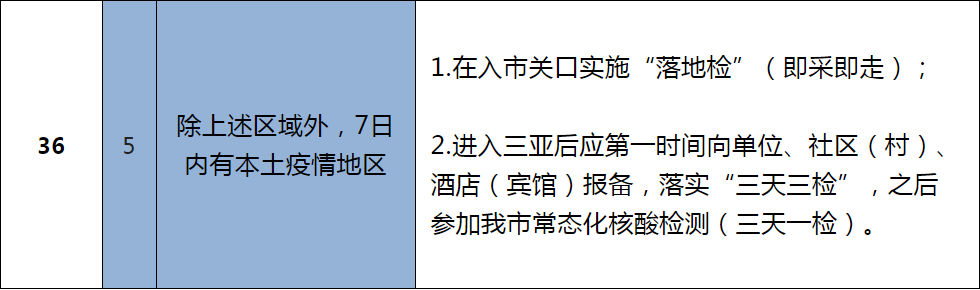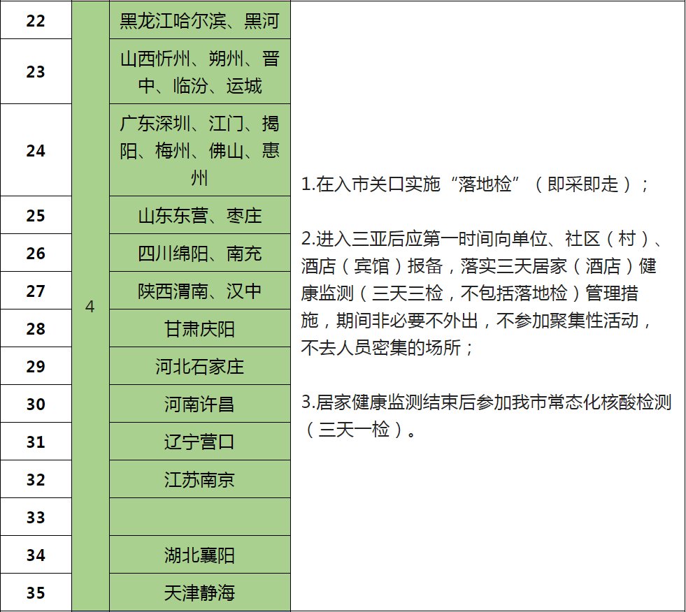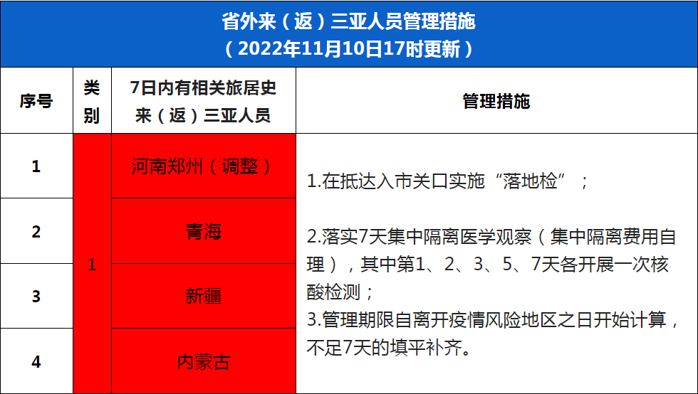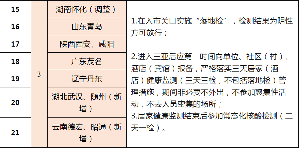 根据疫情形势研判,三亚市疫情防控指挥部决定在原省外来(返)三亚人员管理措施的基础上进行动态调整,具体管理措施详见下表。后续将根据疫情形势动态更新涉疫地区名单及相关管理措施,省外来(返)人员具体管控措施按其抵达三亚时的措施执行。