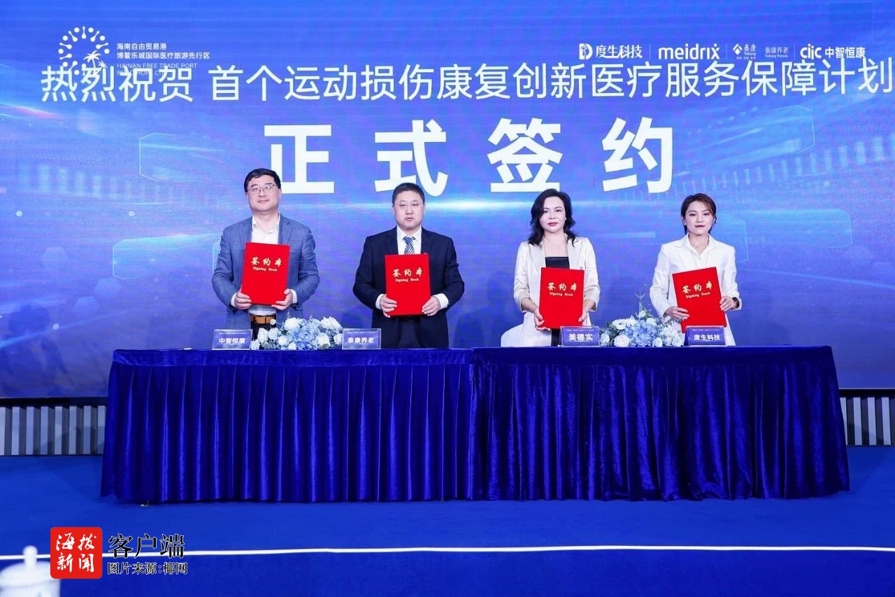 发布会上,泰康养老保险股份有限公司、江苏美德实医疗科技有限公司、中智恒康医疗器械有限公司、度生信息科技(上海)有限公司签署了《运动损伤康复创新医疗服务保障计划合作备忘录》,四方将通过资源共享、优势互补与业务创新,推动 “首个运动损伤康复创新医疗服务保障计划”的建设与发展,并将继续在共建创新医疗保险解决方案等方面展开更全面更深入的合作。