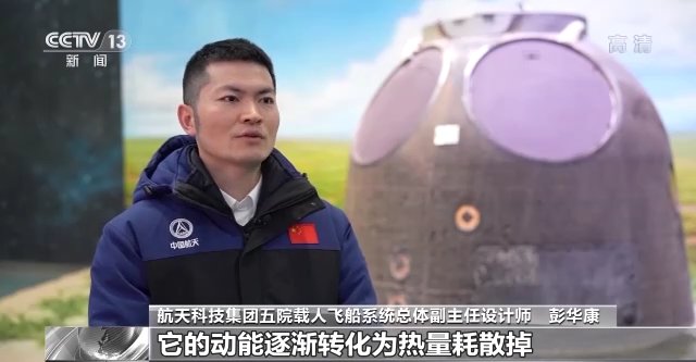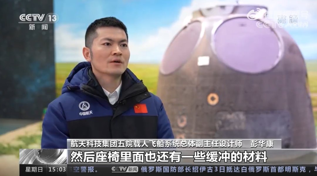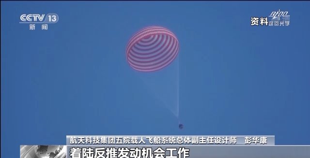 航天科技集团五院载人飞船系统总体副主任设计师 彭华康:当返回舱降落到离地面一米左右的时候,着陆反推发动机会工作,它产生一个向上的冲量,进一步使我们返回舱的速度降到1到2米每秒。然后我们舱内又有缓冲的座椅,然后座椅里面也还有一些缓冲的材料,能够进一步确保返回舱着陆的冲击更小,确保航天员的安全。