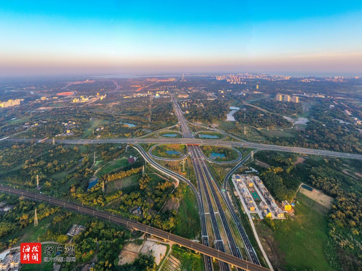 项目起点位于海口市新海港区,接港区规划道路,沿粤海大道、疏港公路向南布线,穿越海口石山火山群国家地质公园,终点位于G98环岛高速公路原疏港互通南侧,接美安科技新城内部道路,路线全长13.73公里,采用双向六车道高速公路标准,设计速度80公里/小时,路基宽度33.5米,整体式桥梁全宽32.2米,分离式桥梁单幅桥宽16.25米。项目于2020年6月开工建设,合同工期36个月,提前6个月建成通车。