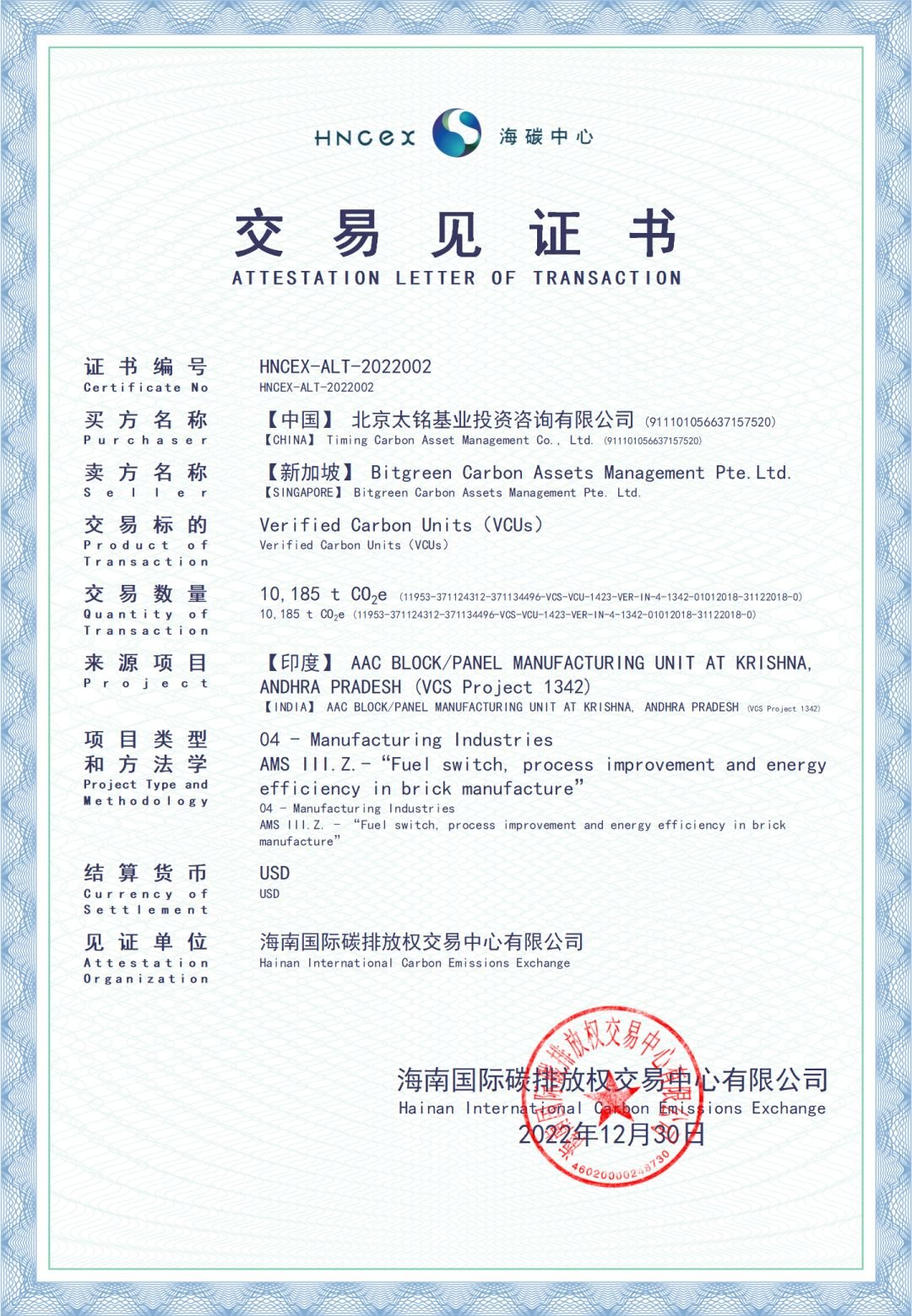 本次首单跨境交易产品为被全球认可的核证碳减排标准(VCS)下的VCUs,交易项目来自“一带一路”沿线国家印度,交易量为10,185吨,买卖双方分别为北京太铭基业投资咨询有限公司、BITGREEN CARBON ASSETS MANAGEMENT PTE. LTD。
