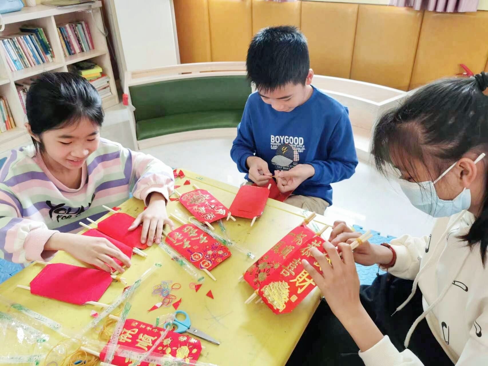 到了制作花灯的环节,小朋友们跃跃欲试,积极展现他们的想象力与动手能力。在志愿者的示范和指导下,他们用红包袋、彩色卡纸、竹筷、红绳等材料开始制作自己的小花灯。剪形状、搭框架、玩创意……很快便展示了别具特色的花灯成品。各式各样的的花灯既烘托了节日喜庆气氛,同时也凝聚着小朋友们的新年愿望、美好祝福。
