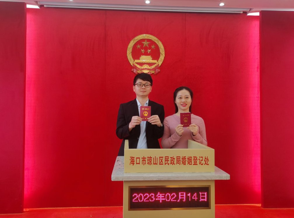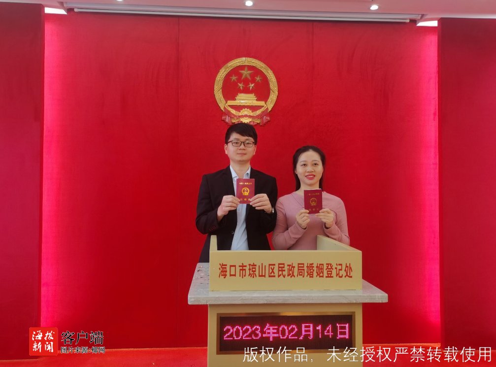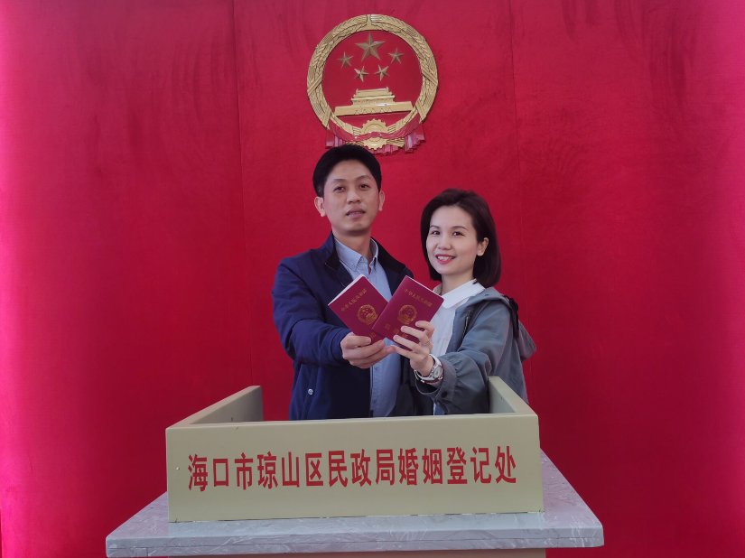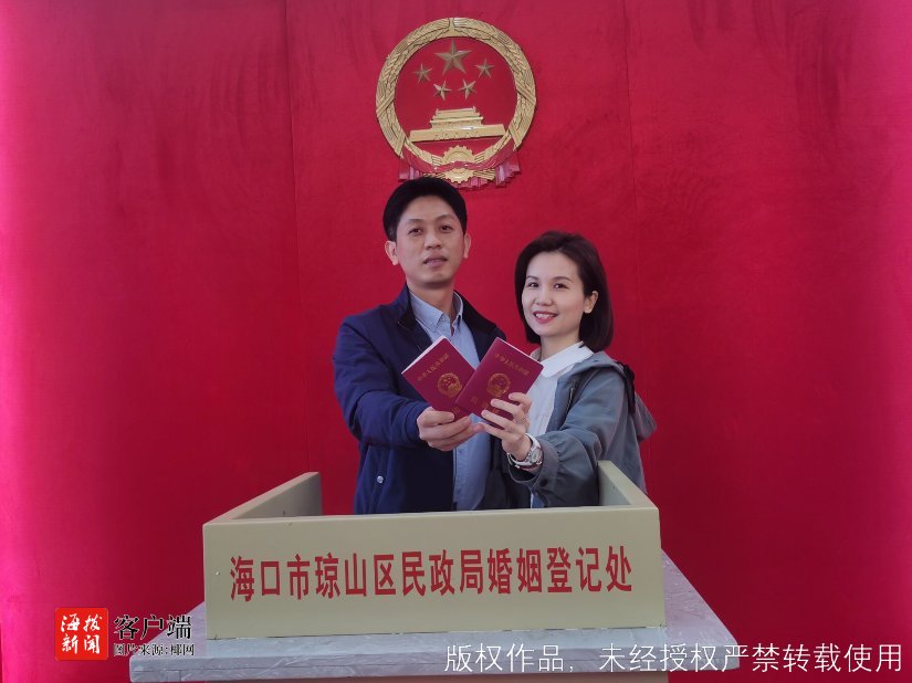 据了解,陈先生与廖女士都是海南人,为了今天顺利领证,两人特地休假一天。廖女士说:“领完证后我们两人准备去浪漫约会,然后晚上回家跟亲朋好友分享喜悦。”