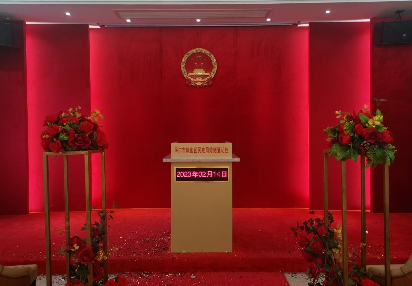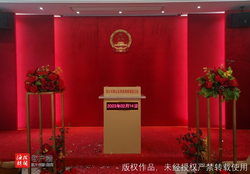 为了能更好、更高效地服务新人,今日琼山区民政局婚姻登记处有7名海政社工志愿者前来维持秩序,开展活动服务,此外,他们还精心布置了婚姻登记处背景墙,营造喜庆祥和、神圣庄严的氛围,引导新人按程序办理。