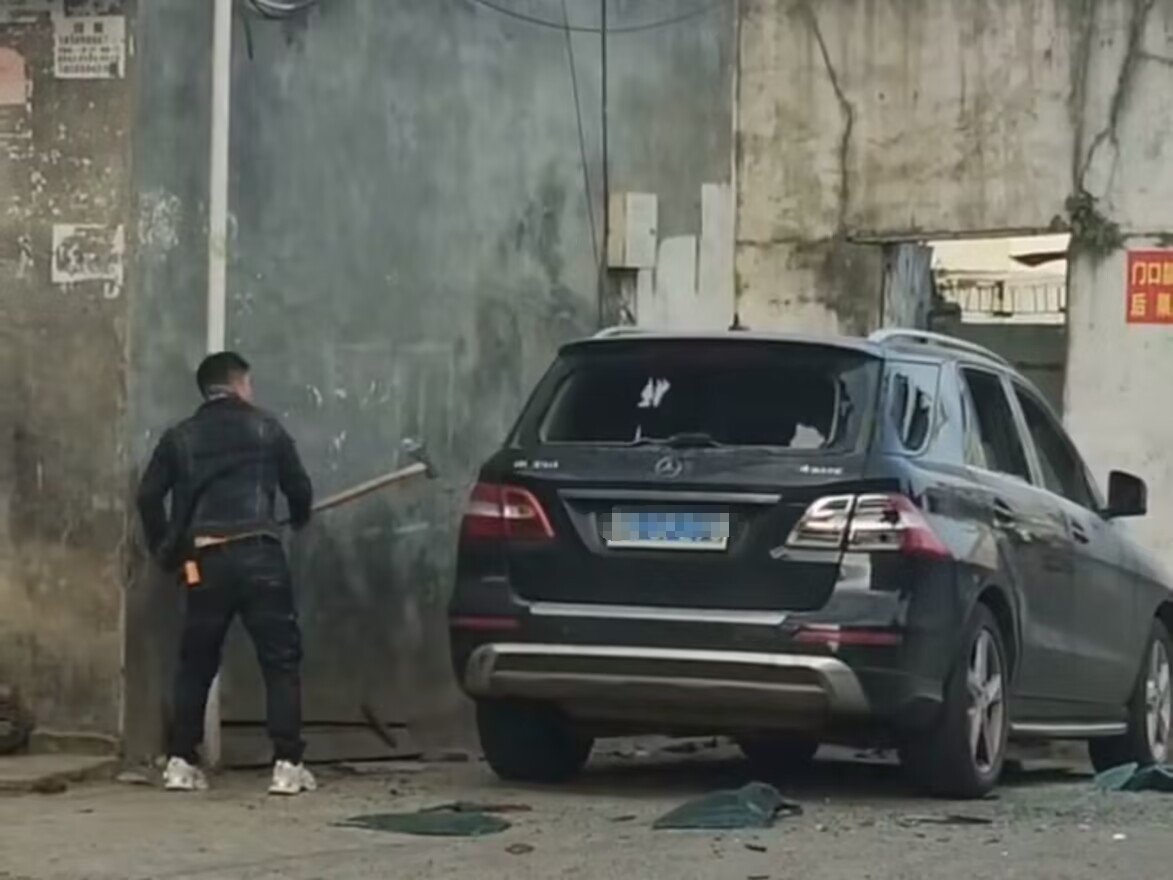 从网友提供的视频、图片中看到,一辆黑色奔驰越野车停靠在仓库大门左侧,一名身穿黑色长裤及黑色牛仔外套的男子手持斧头疯狂打砸该车辆,车辆前后挡风玻璃和两侧车窗均被打破,车身多处也遭受击打,破碎的车玻璃散落一地,男子手持的斧头也被打弯。