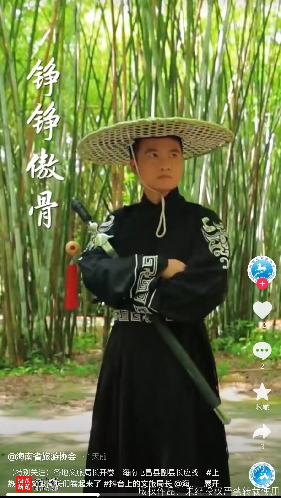 如今是新媒体传播时代,当地文旅该如何“放大招”花式宣传旅游资源特色?国际旅游岛商报记者注意到,今年3月,保亭黎族苗族自治县副县长吕妍拍摄的保亭旅游推介短视频冲上热搜,之后,屯昌县副县长吴多毅化身“侠客”形象、定安县旅文局副局长黄慧着装“琼剧”服饰宣传家乡等短视频相继推出,频频冲上热搜前十,掀起当地文旅推介热潮。