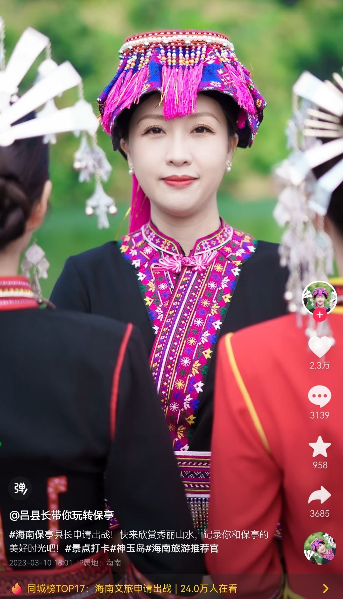 此外,保亭黎族苗族自治县副县长吕妍的抖音号“吕县长带你玩转保亭”自上线不足20天就发布的4条短视频,内容以宣传保亭自然美景风光、民俗文化、黎风民俗、保亭红毛丹文化等为主。其中,3月10日发布的《快来欣赏秀丽山水,记录你和保亭的美好时光吧!》成为同城热搜榜,点赞量超过2.3万,评论量达3139多条、转发量达3685多次。视频中,吕妍身着保亭苗族特色服饰,盛邀全国、全世界游客来“打卡”保亭秀丽山水。