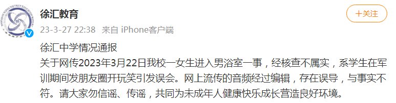 上海市徐汇区教育局官方微博@徐汇教育 3月27日发布徐汇中学情况通报:关于网传2023年3月22日我校一女生进入男浴室一事,经核查不属实,系学生在军训期间发朋友圈开玩笑引发误会。网上流传的音频经过编辑,存在误导,与事实不符。请大家勿信谣、传谣,共同为未成年人健康快乐成长营造良好环境。