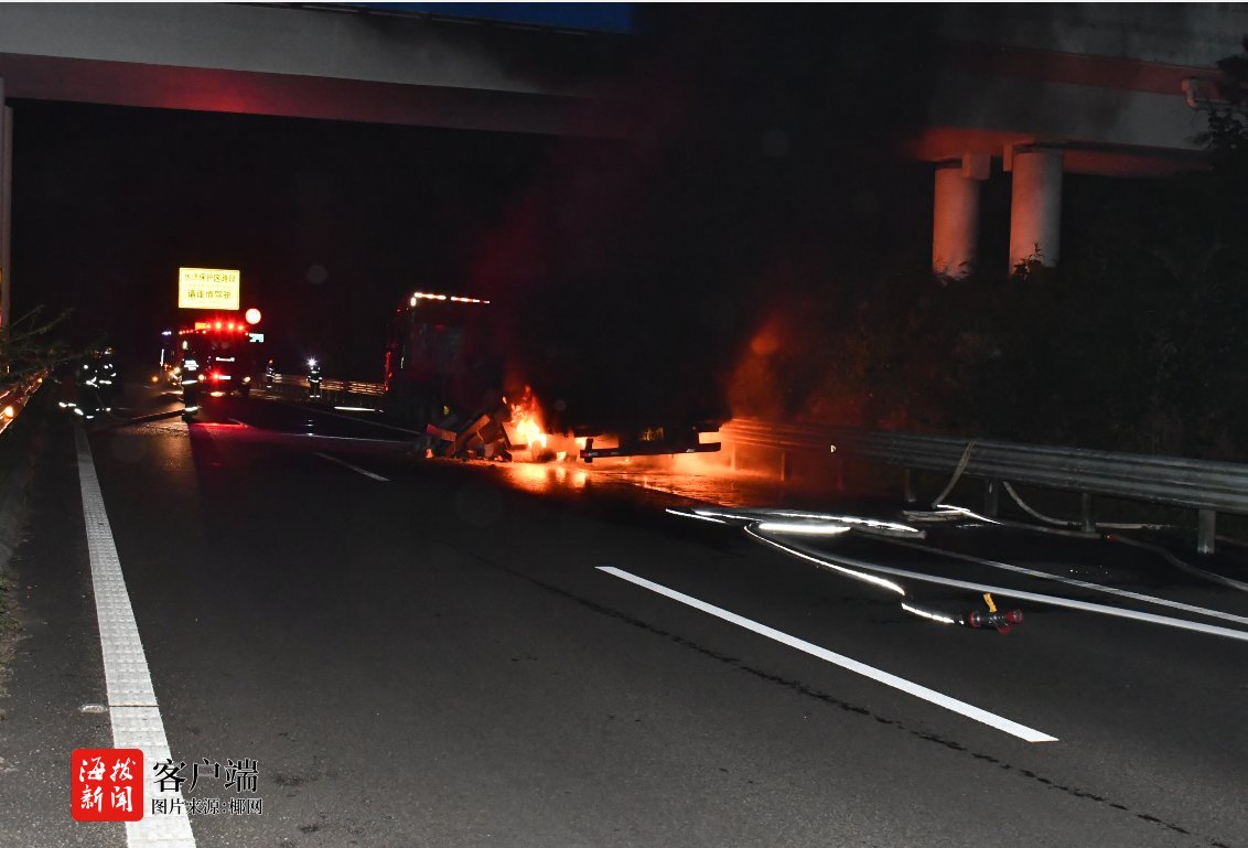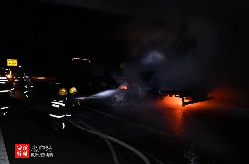 商报全媒体讯(椰网/海拔新闻记者 李兴民 通讯员 黄博阳 摄影报道)4月16日23时21分,琼中县消防救援大队指挥中心接到群众报警称,位于琼中县G9813万洋高速乌石路段有一辆大货车着火,现场火势凶猛,情况非常危急。接警后,指挥中心立即调派营根消防救援站3辆消防车21名消防救援人员、黎母山专职消防救援站1辆消防车7名消防救援人员赶往现场处置。