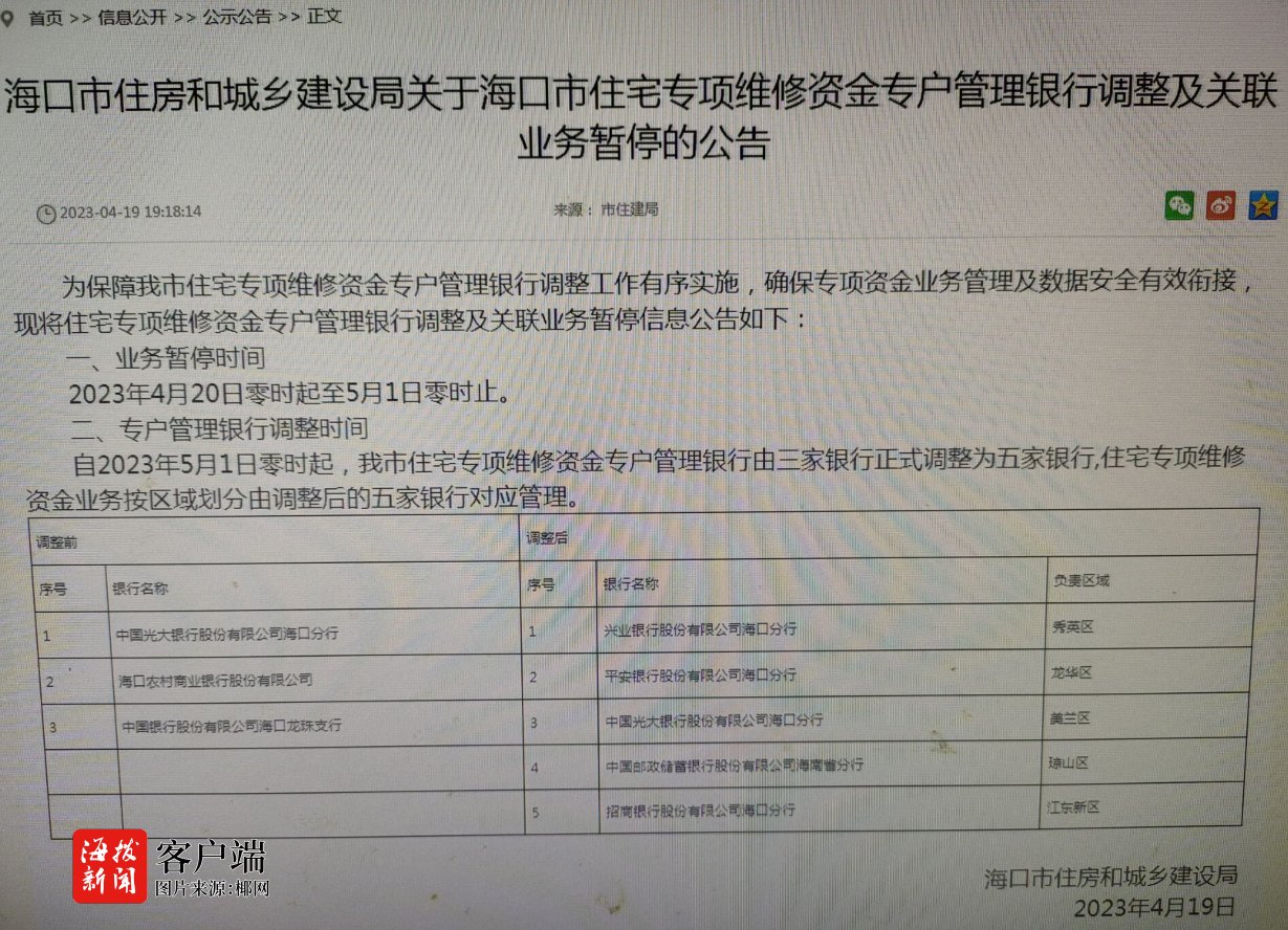4月20日零时起!海口市住宅专项维修资金专户管理银行调整及关联业务暂停