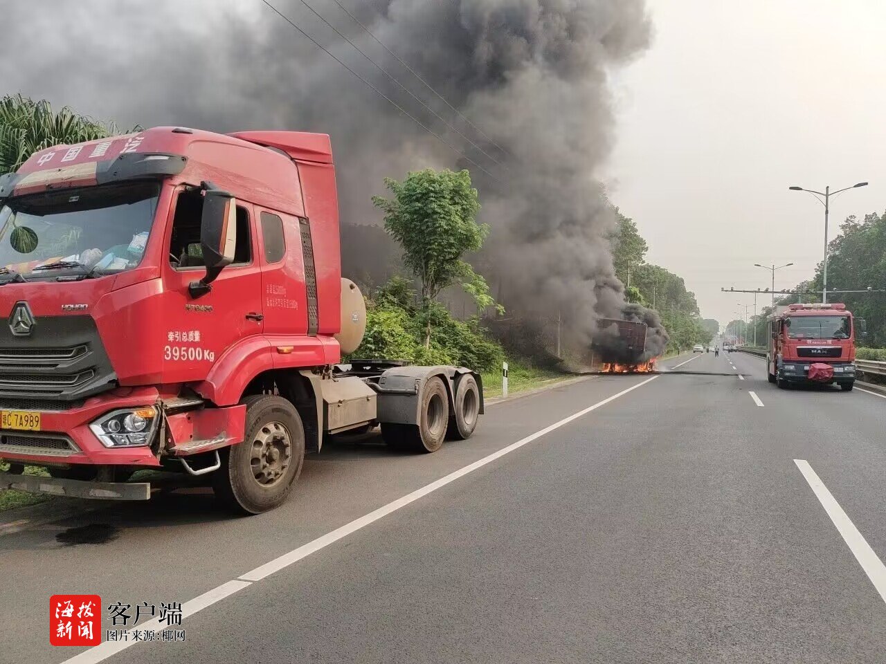4月19日8时13分,接群众报警,位于澄迈县福山镇金马大道大丰往金江方向3公里处,一辆正常行驶的挂车后轮胎突然起火,火势处于猛烈燃烧阶段,车厢完全被大火吞没并冒出滚滚黑烟。