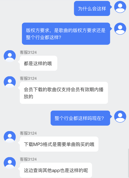 “都是这样的,会员下载的歌曲仅支持会员有效期内播放,下载MP3格式需要单曲购买。”为此,记者联系了酷狗音乐客服,该客服表示,除了酷狗音乐外,其他app也存在这样的现象,用户若想要永久播放一首歌曲,则需要进行单曲购买。