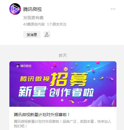 商报全媒体讯(椰网/海拔新闻记者 林思冰)5月9日,腾讯短视频产品腾讯微视通过微信公众号公布新星计划,并对外招募,面向历史未在腾讯微视发表过视频,抖音、快手以及小红书3W+粉丝的个人创作者。规则生效时间为5月8日-6月30日。根据激励规则,新作者入驻后流量可加成50%。