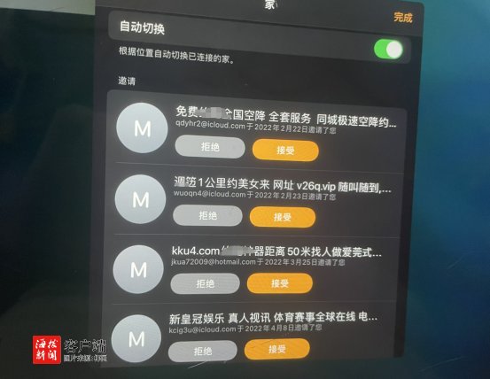 而收到这样信息的苹果用户们,则不止iMessage这一种形式。“去年以来,我的苹果手机和iPad总是收到这类信息,方式还不一样,手机是通过‘家庭’软件给我发送涉黄和博彩信息,iPad是通过日历给我发送。”市民符女士告诉记者,自己的iPad已使用三年,苹果手机使用了两年,而icloud账号(即苹果用户账号)则使用了五年。
