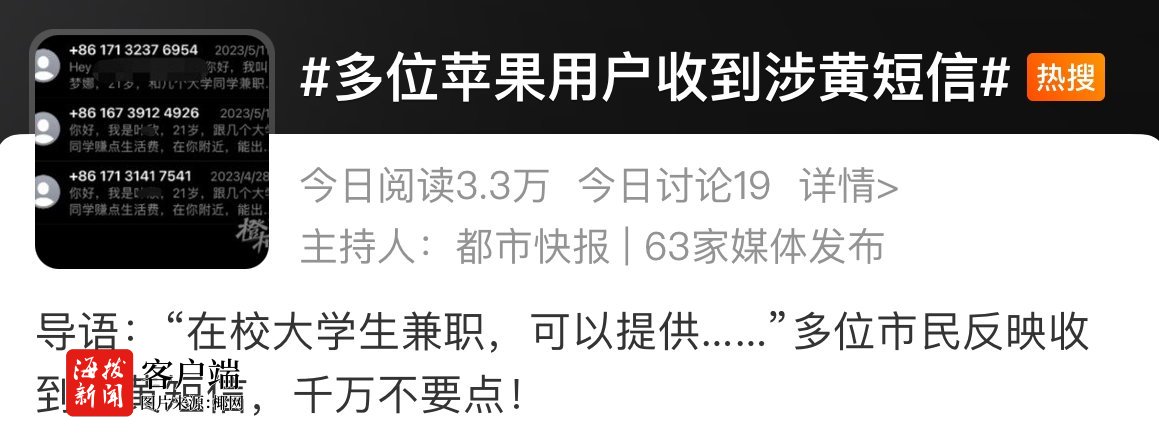 近日,有不少苹果用户反映总是收到涉黄短信,相关词条也随之冲上热搜。有不少苹果用户和网友表示,收到的信息多为涉黄信息和博彩信息,信息内容称自己是在校大学生要兼职,可以提供色情服务,并且附带链接,若联系则需要通过浏览器打开链接去查看。而收到信息的苹果用户性别不一,有男有女,来自各个市县。此外,信息多通过苹果手机的iMessage形式进行发送。