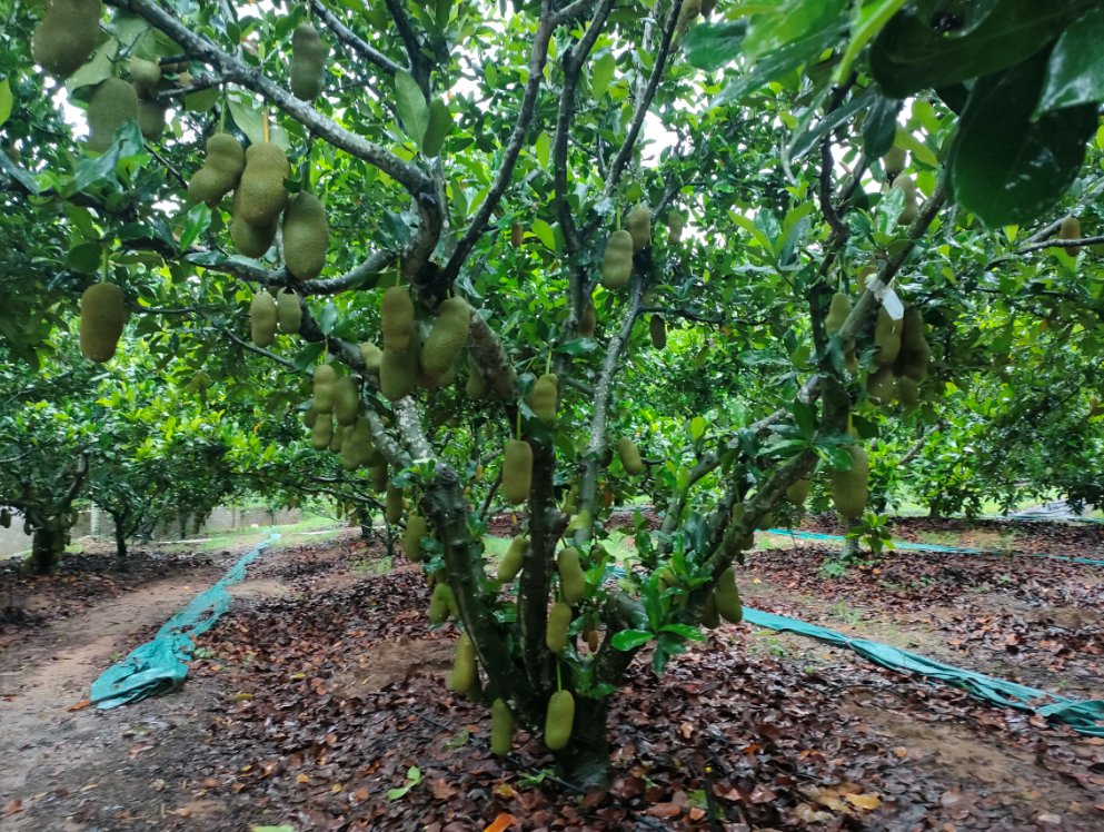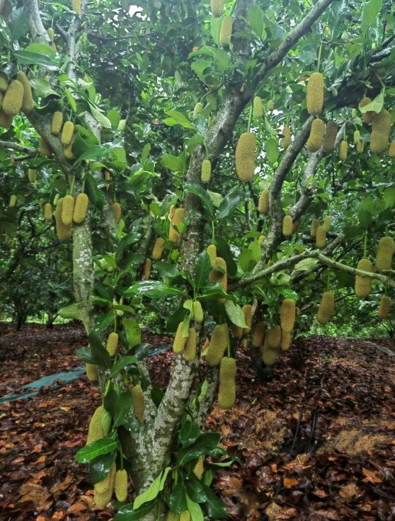 三亚是闻名全国的热带水果之乡,独特的地理位置和优越的气候使这里成为培育热带水果的天堂。它是一棵生长在育才榴莲蜜基地的奶白榴莲蜜大树,2008年来到育才榴莲蜜基地,扎根在这一片土地,成长期过后,2011年开始开花结果。它喜欢高温环境,害怕低温,低于7℃就不能正常生长。它的果实外形像菠萝蜜,果肉很密也像菠萝蜜,但果实口感很独特却和榴莲差不多,特点就是“香糯甜”。