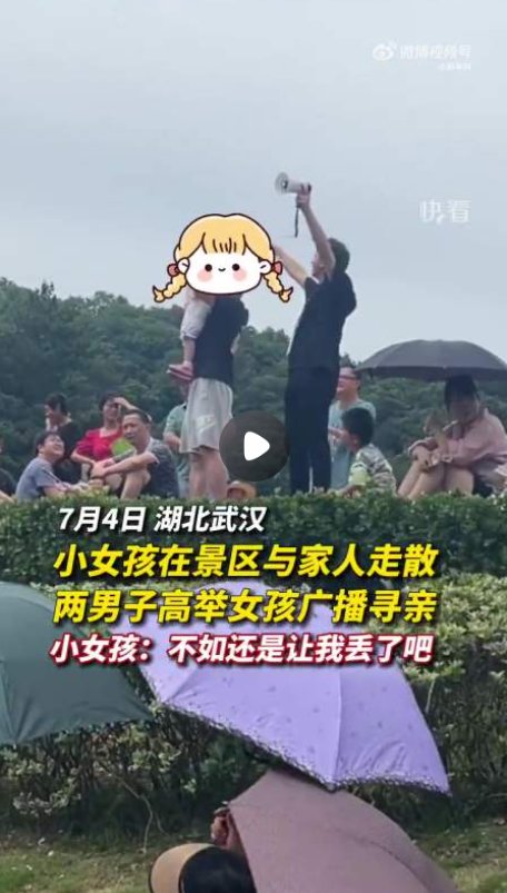 非常社死的一次举高高。近日,在湖北武汉,小女孩在景区与家人走散,两男子高举女孩广播寻亲