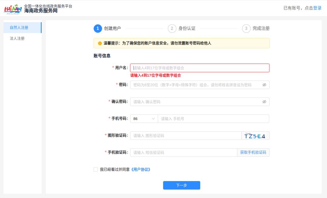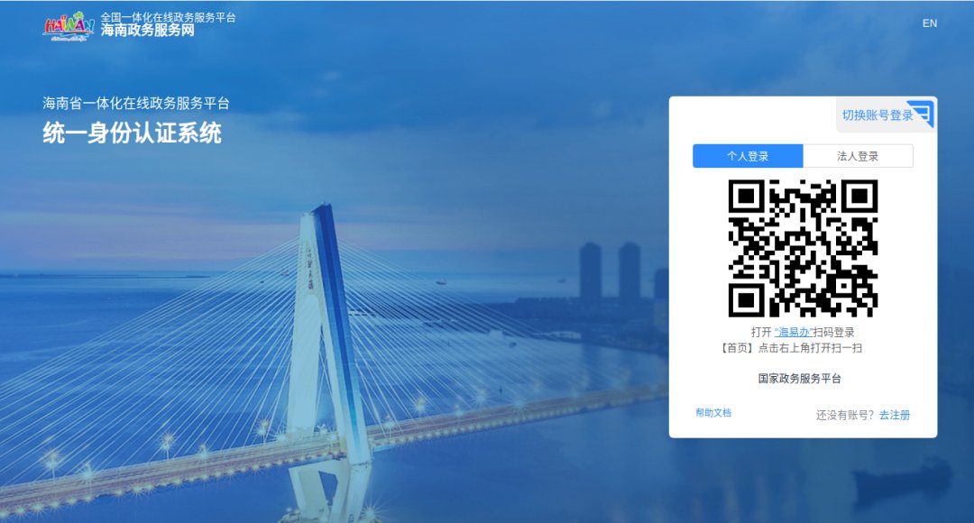 未注册个人用户可点击「立即注册」,跳转至海南省政务统一身份认证系统注册账号。