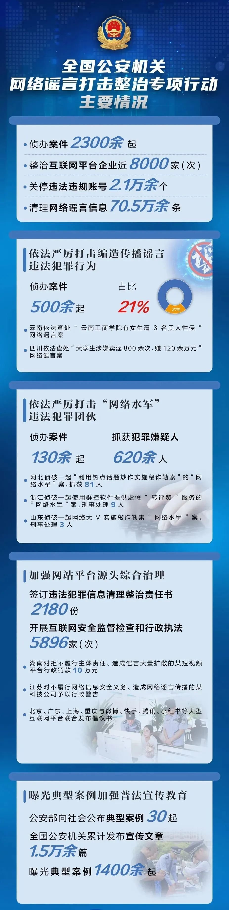 1.公安部21日通报开展网络谣言打击整治专项行动100天举措成效。行动期间,全国公安机关共侦办案件2300余起,整治互联网平台企业近8000家(次),依法关停违法违规账号2.1万余个,清理网络谣言信息70.5万余条。详细>>>