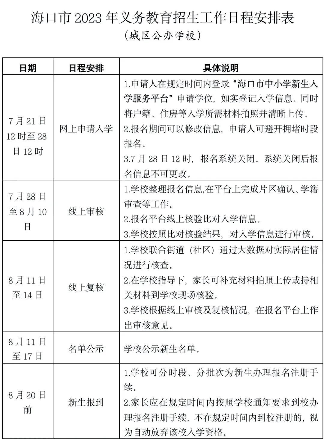 2.21日,海口市2023年义务教育学校招生工作实施细则正式发布。今年我市招生工作内容有哪些?工作时间如何安排?家长线上申请学位有何注意事项……一起来看看。详细>>>