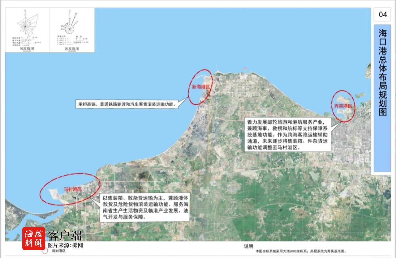 在港口总体布局上,规划海口港将维持“一港三区”的总体发展格局,即海口港由秀英、新海、马村三个港区组成。秀英港区:包括部分秀英港老码头和南海明珠码头,着力发展邮轮旅游和港航服务业,兼顾海事、救捞支持保障系统基地等功能。作为跨海客滚运输辅助通道,保留客滚运输应急调峰功能,逐步将集装箱、件杂货运输转移至马村港区。新海港区:是海南省海峡交通运输的核心港区,包括新海汽车客货滚装码头、粤海铁路火车轮渡码头和即将新建的湛海高铁轮渡码头。主要保障海南省铁路及公路跨海运输,承担高铁、普通铁路轮渡和汽车客货滚装运输功能。马村港区:是海口港货运核心港区,主要服务海南省生产生活物资及临港产业发展、油气开发与服务保障。以集装箱、散杂货运输为主,兼顾液体散货及危险货物滚装运输等功能。